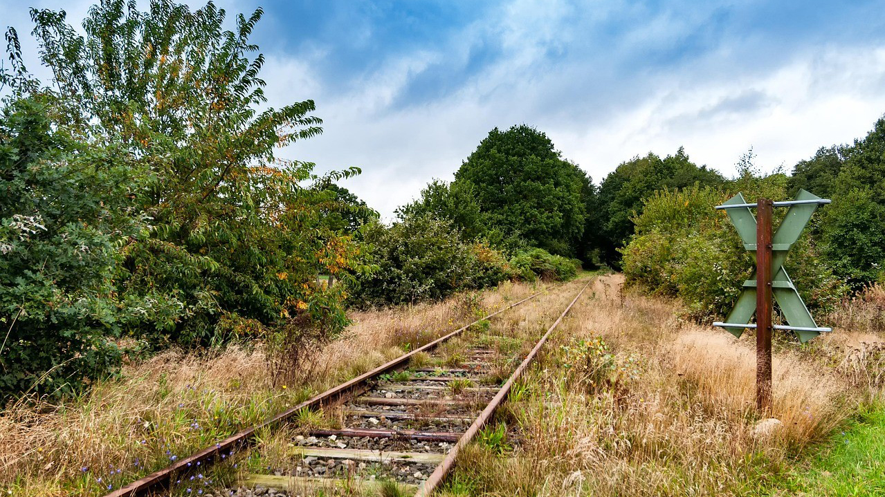 Ungenutzte Bahnschienen, von Gras überwuchert