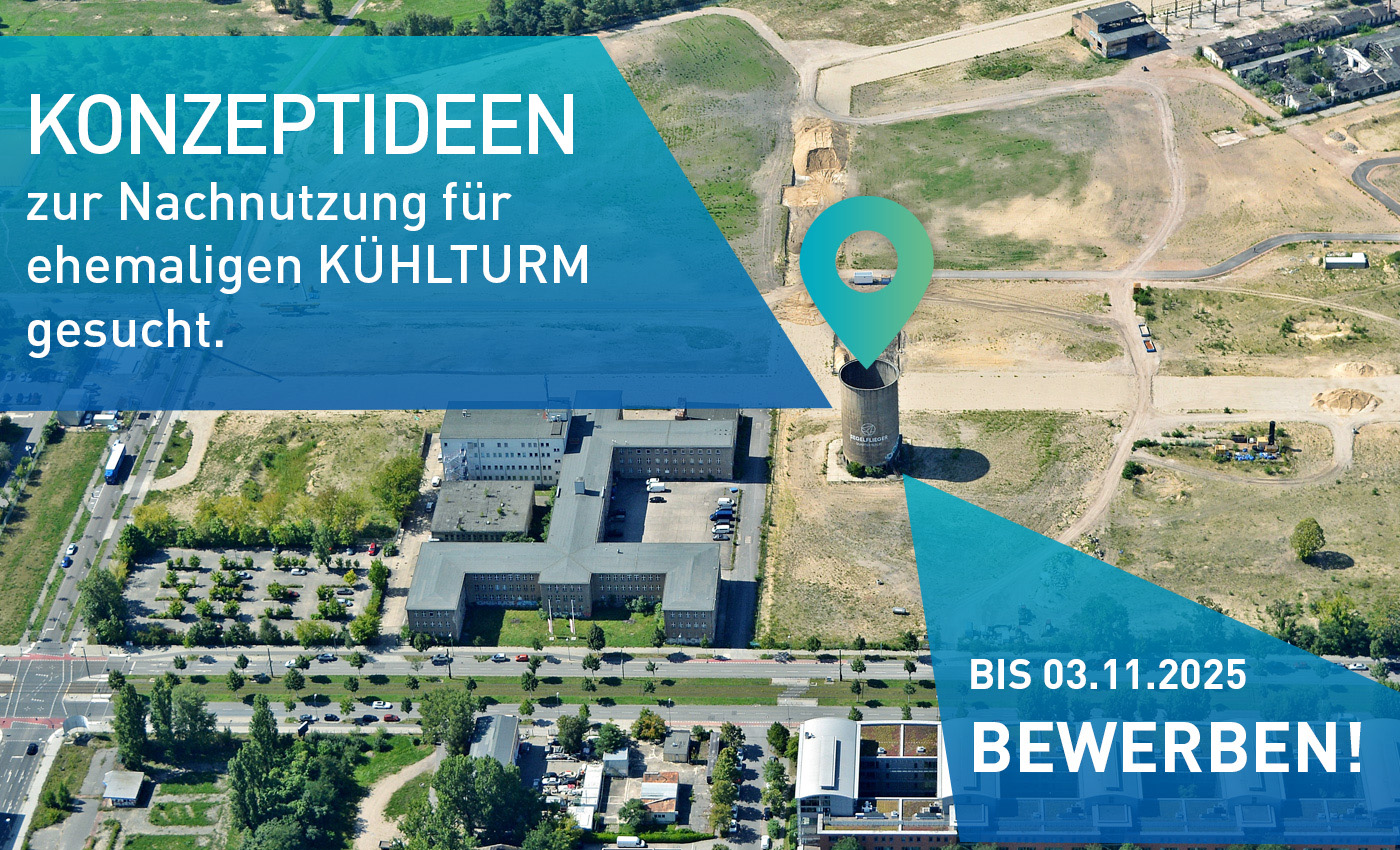 Der ehemalige Kühlturm im Segelflieger Quartier wartet auf eine neue Perspektive. Er war Teil eines früheren Motorenprüfstands des VEB Motorenwerks Johannisthal, das in den 1960er Jahren Großdieselmotoren für Schiffe und Lokomotiven produzierte.