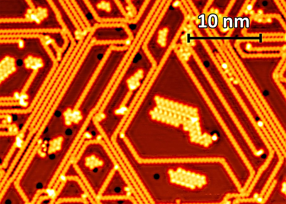 Dr. Andrei Varykhalov hat mit seinem Team zunächst am Kryo-Rastertunnelmikroskop Phosphorketten auf Silber hergestellt und charakterisiert. Die Bilder zeigen, dass sich kurze P-Ketten in drei unterschiedlichen Richtungen auf dem Substrat bilden, die untereinander 120-Grad Winkel haben.